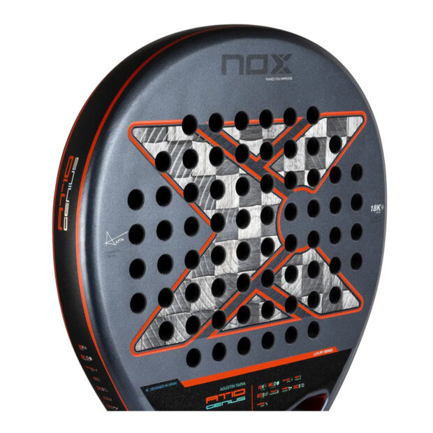 The Nox AT10 Luxury Genius 18K Alum 2025 by Agustín Tapia Padel Racquet offers unmatched precision and power. Featuring aluminized carbon fiber and a double rough finish, it provides excellent control and spin, making it perfect for advanced players.