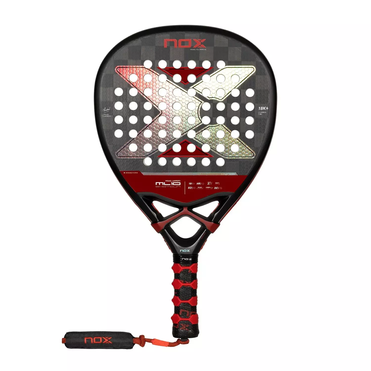 The NOX ML10 Shotgun 18K Luxury 2024 is made for players who want power and precision. It has a diamond-shaped design taht puts the sweet spot higher on the racquet and facilitates powerful shots and aggressive play. The racquet is made of advanced materials and technologies to enhance performance, durability and comfort.