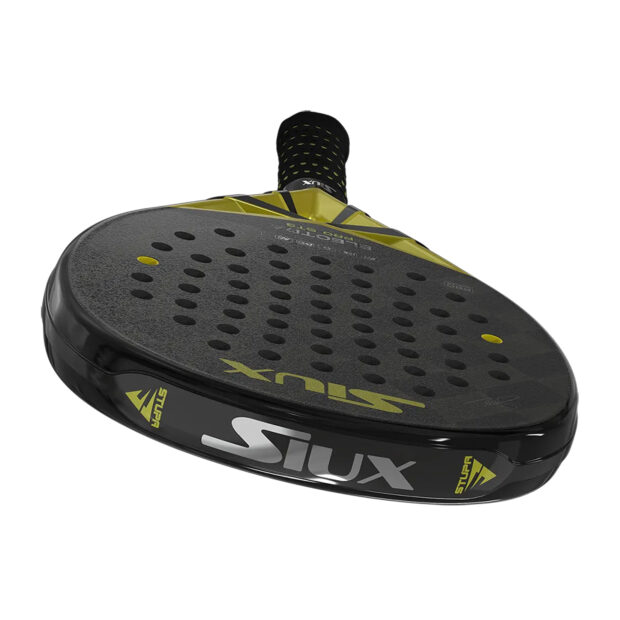 The Siux Electra Pro ST3 is designed to meet the needs of high-performance players. The racquet has a teardrop shape that gives a mix of control and power and the 15K carbon face provides solid hits and enhances durability. It also has a medium EVA core and dual anti-vibration systems, which offers a stable yet explosive hitting experience.